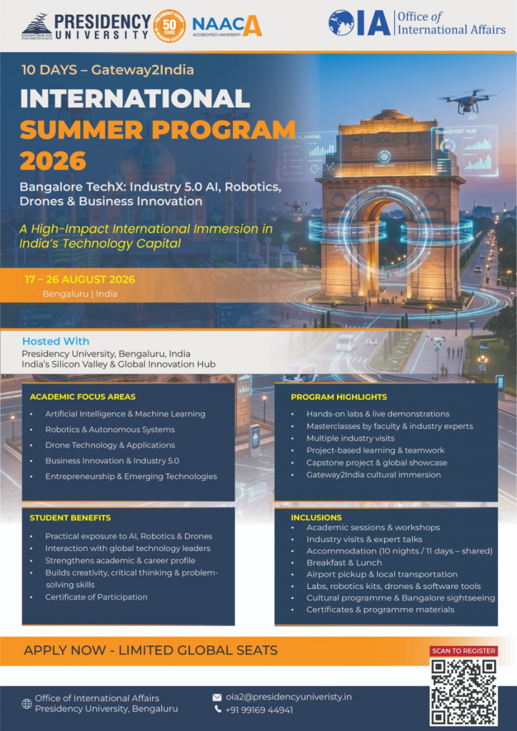 - Registration: Register via the on-campus application system athttps://forms.office.com/r/aWxtY7k0ii. Then sign up via https://forms.office.com/r/jEukJgJaWS?origin=lprLink. Please reach out to oia2@presidencyuniversity.in for more information.